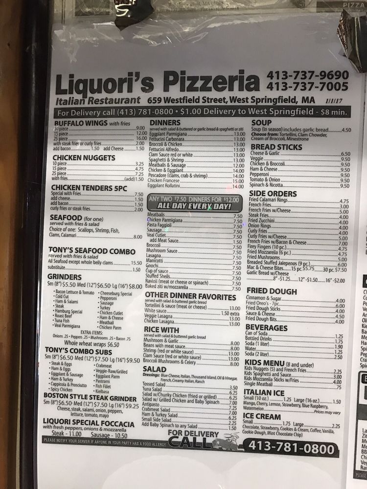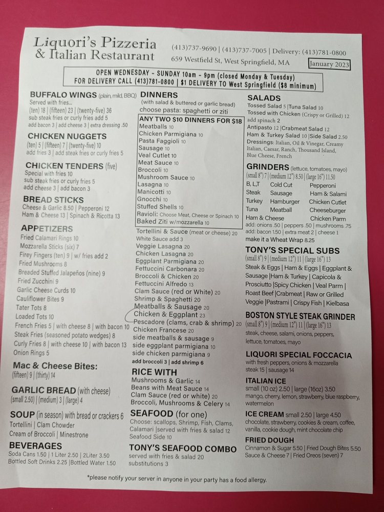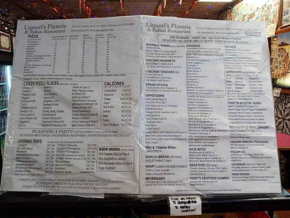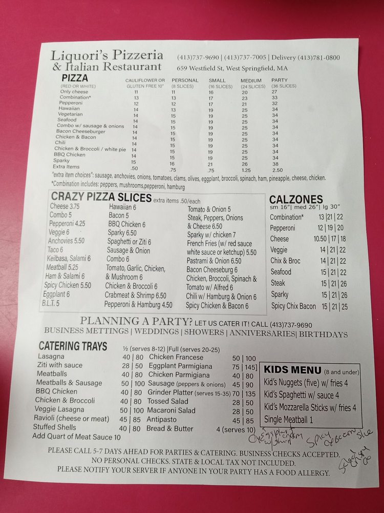 Introducing Liquori's Pizza, located at 659 Westfield St West Springfield, MA 01089. This pizzeria offers a wide range of 16 Small Pizza options, such as Combo with Sausage & Onions, Seafood, BBQ Chicken, and more. Additionally, they serve 12 Medium Grinders and 16 Large Grinders with various fillings like Cold Cut, Chicken Parm, and Tuna Fish. Customers rave about the quality and taste of the food, with compliments on the crust, sauce, and portion sizes. The friendly atmosphere and unique decor, including shelves of penny candy, add to the overall experience. Liquori’s Pizza is a must-visit spot in Western Massachusetts, especially if you're craving delicious pizza or calzones.